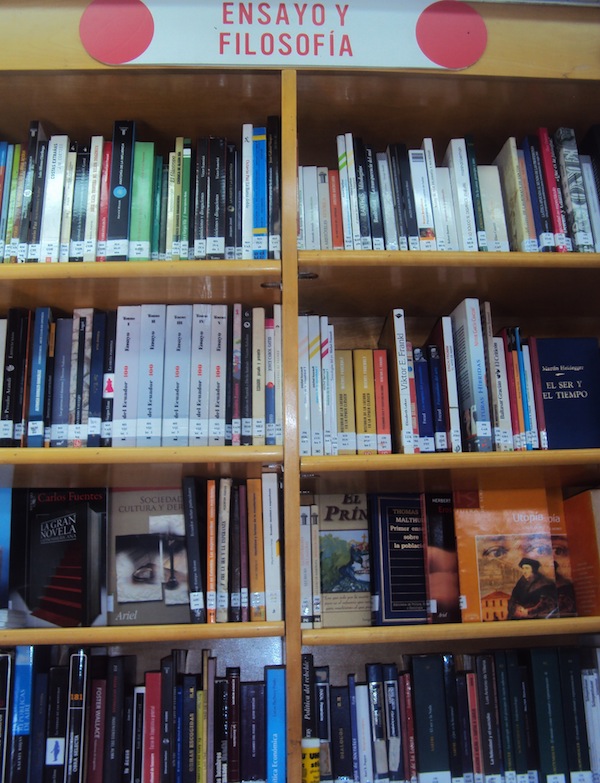 Vuelvo a dar un giro de 180 grados y leo en “Latinoamérica”. ¡Vaya que hay bastante Bolaño y García Márquez! Me vuelvo a preguntar ¿habrá Todo hombre es una isla, de Montalbeti, o La sexualidad de la pantera rosa, de Efraím Medina Reyes? Todavía no sé qué llevar, así que doy otro giro y veo a Thomas Pynchon. Sí, podría considerarlo. veo a Ishiburo y recuerdo alguna recomendación de un novelista acerca de este autor. Camino un poco más y noto que hay varias biografías y uno que otro libro medio extraño, tipo best-sellers (es casi una obligación tener uno que otro y no los culpo). Paso a la parte de “Poesía” y veo que hay menos libros. Es de esperarse, siempre sucede algo así en Ecuador. Sin embargo, sigo leyendo los nombres. Neruda, no podía ser de otra manera. Busco algo de Nicanor Parra para mi tesis, pero no lo encuentro, quizás alguien ya se lo ha llevado y he llegado tarde. ¡Entonces me arrepiento de vivir al norte!