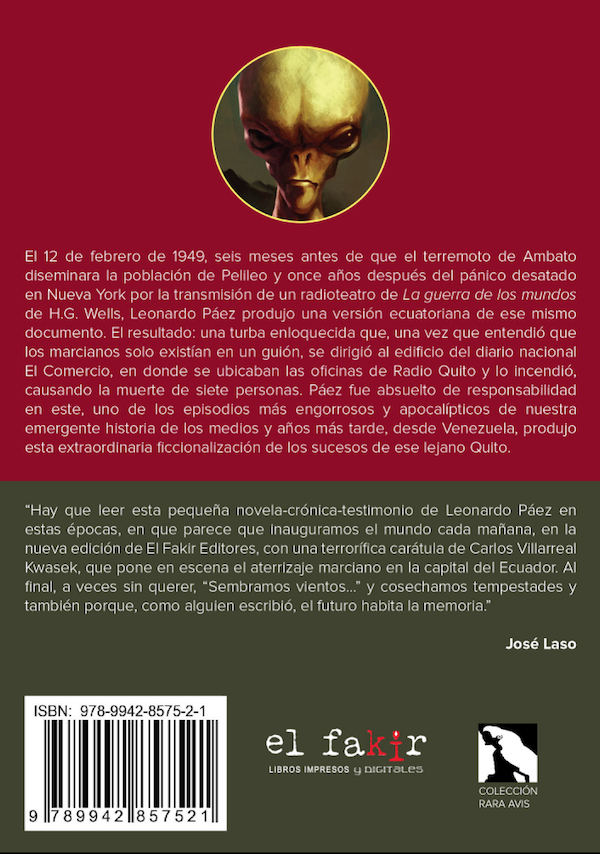 Los que siembran el viento, la novela más quiteña que jamás haya leído, llegó a mis manos vía el Cono Sur. Javier Arano, cineasta argentino, me escribió hace siete años para ver si nos podíamos reunir. Él estaba viviendo en Quito y la familia de su esposa ecuatoriana le había contado la historia del truncado aterrizaje marciano en la capital. Le pareció imposible que alguien no hubiera hecho una película sobre el tema. Preguntó y, cuando confirmó que no había un largometraje de ficción ni un documental sobre la versión radial de La guerra de los mundos en Ecuador, decidió que él lo haría. Alguien le contó que yo estaba escribiendo una novela sobre la noche del 12 de febrero de 1949, en la que incendiaron Radio Quito, y me contactó. Nos reunimos algunas veces, le conté lo que sabía y él me dio la novela que escribió el libretista y mentalizador del desembarco extraterrestre en Quito (que un amigo había conseguido en Venezuela). El tiempo pasó y perdimos contacto. Hace dos años lo busqué para contarle que la novela sobre La guerra de los mundos que escribía se había convertido en un cuento largo y que lo quería invitar a la presentación de La muerte silba un blues; quería saber, además, qué había pasado con su proyecto de hacer un documental. Me contó que había logrado ubicar a la hija de Páez en Venezuela y que estaba negociando los derechos del libro que me había regalado en fotocopia en el 2009. Por ese entonces ya hablábamos con César y Álvaro, los otros miembros de El Fakir, sobre cuál sería el libro con el que arrancaríamos la editorial. Hice más copias de mi copia y se las di para que la leyeran. Estuvimos de acuerdo en que el texto de Páez era ideal para lanzar la editorial y, con el contacto de Ximena Páez que Javier nos facilitó, comenzó la odisea de lograr un acuerdo con ella. Todavía no habíamos publicado nada, ni siquiera teníamos una página web, cuando menos le debió resultar extraño que después de tantos años de silencio, dos personas se interesaran por los derechos de la obra de su padre. Los correos se sucedieron, los FedEx fueron y vinieron y el tiempo comenzó a pasar. Hernán Hoyos, Powerpaola y el propio Fakir reclamaron su espacio en la editorial pero por fin llegó el día.