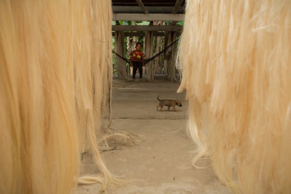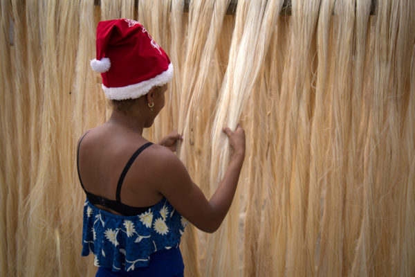 Los callos se deben al uso del cuchillo en su trabajo como ‘tusero’. En el mundo del abacá existen seis tareas manuales que los trabajadores se reparten. Además del ‘maquineo’ y el ‘tuseo’, está el ‘zunqueo’ y el ‘talleo’ que consiste en quitar las hojas a los tallos; el ‘burreo’ o el traslado de la fibra en burros hasta la máquina, y el ‘tendaleo’, que significa colgar las fibras en galpones tipo invernaderos para secarlas. Esta última tarea la hacen, sobre todo, las mujeres. Ángela, una madre adolescente, cubre su cabeza con un gorro navideño para evitar el polvillo que sale del abacá.