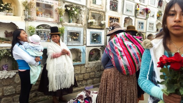 “Se van las penas y tienes que estar alegre”, me dice Juan. Alegre está él y su familia. Cuando termina la canción, “¿y la yapita? ¿hay la yapita?”, las parejas se separan. Escupen las hojas de coca que estaban masticando. Me sonríen, me dan la mano, me preguntan cómo celebramos en Ecuador y me cuentan que en Todos Santos, dos días en que los bolivianos homenajean a sus muertos (y cuando, según la Alcaldía de La Paz, el 99% de los nichos son visitados), el objetivo final es compartir. “Dicen que las almitas llegan en esta fecha. Tenemos que dar a cada gente que viene a rezar y reza con la familia. Es para compartir. A los mejores rezadores se da mejor”, reitera Juan.