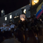 Dos días después de la gran marcha, la noche del sábado 21 de abril, doña María Adelina Velázquez –bajita, muy bajita y cubierta la cabeza con una gorra menos blanca que sus canas– se acercó a un pequeño grupo reunido en la Plaza Grande, al pie del Palacio de Carondelet, la casa presidencial en Quito. La mujer llegó como si tuviera recelo, igual que las otras noches. Habría terminado de vender en ese lugar donde siempre vende dulces y cigarrillos, sobre la calle Chile, muy cerca de la Plaza. Alguien la invitó y alguien más le entregó una vela encendida para que se uniera a la vigésima sexta vigilia. Ella tomó la vela entre sus dedos octogenarios y calladita se quedó, mirando hacia el arreglo de rosas rojas y blancas, mirando a los compañeros de Paúl, de Javier y de Efraín recordarles.