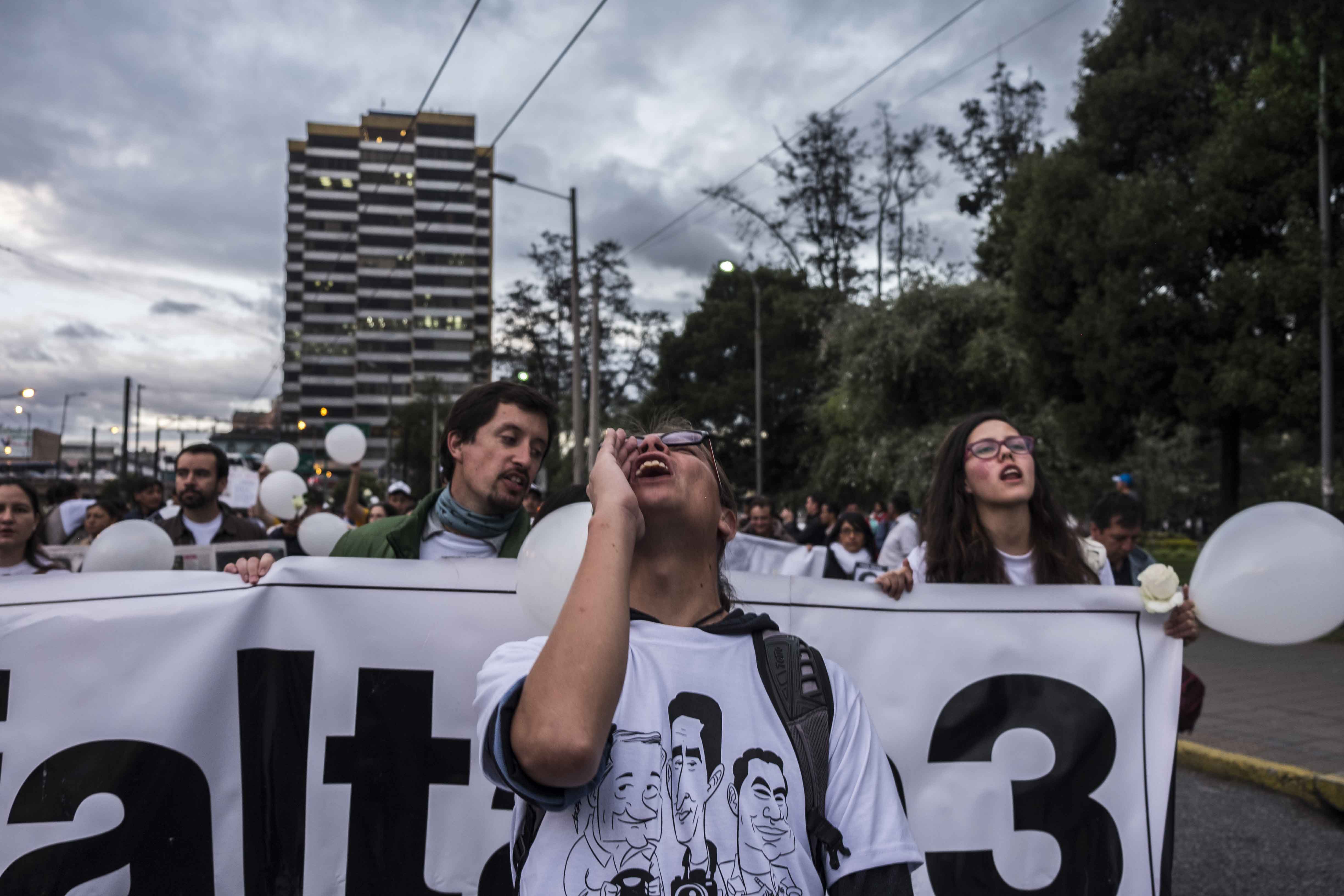 Los familiares del equipo periodístico de diario El Comercio –la frente en alto, su voz fuerte aun con el indescifrable dolor por dentro–, gritaron en cada vigilia, en cada marcha, también por las familias de los cuatro infantes de Marina muertos en la zona fronteriza: el suboficial Luis Alfredo Mosquera Borja, el cabo segundo Jairon Estiven Sandoval Bajaña, el marinero Sergio Jordán Elaje Cedeño y el cabo Wilmer Álvarez Pimentel; y aquel jueves encabezaron el reclamo de miles de marchantes por el regreso inmediato y a salvo de Óscar y Katty que nunca ocurrió. Es que no estamos completos. Unos pensaban en que al menos había que dar sepultura a los cuerpos de los tres. Otros deliraban con ciertos deseos de venganza. Unos solo abrazaban y se dejaban abrazar y otros recordaban entre bromas cómo caminaba el Paúl, la falta de atención del ‘Segarrita’ a su celular o el empeño del ‘Javi’.