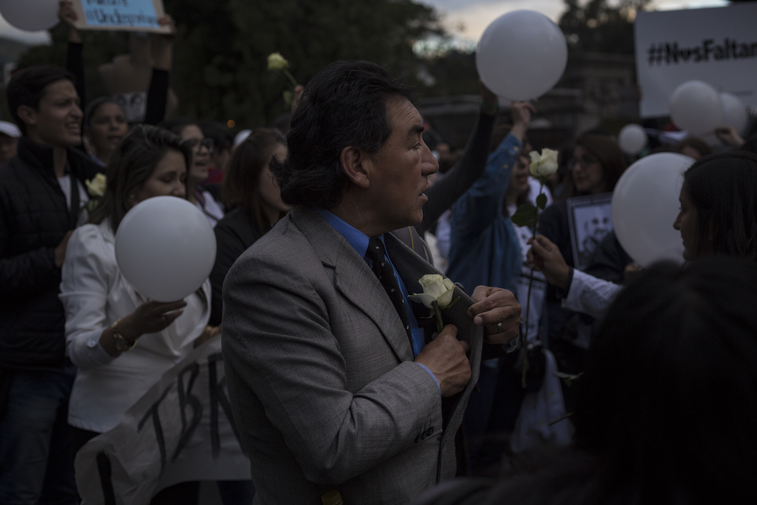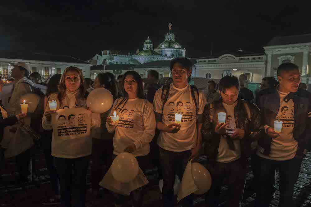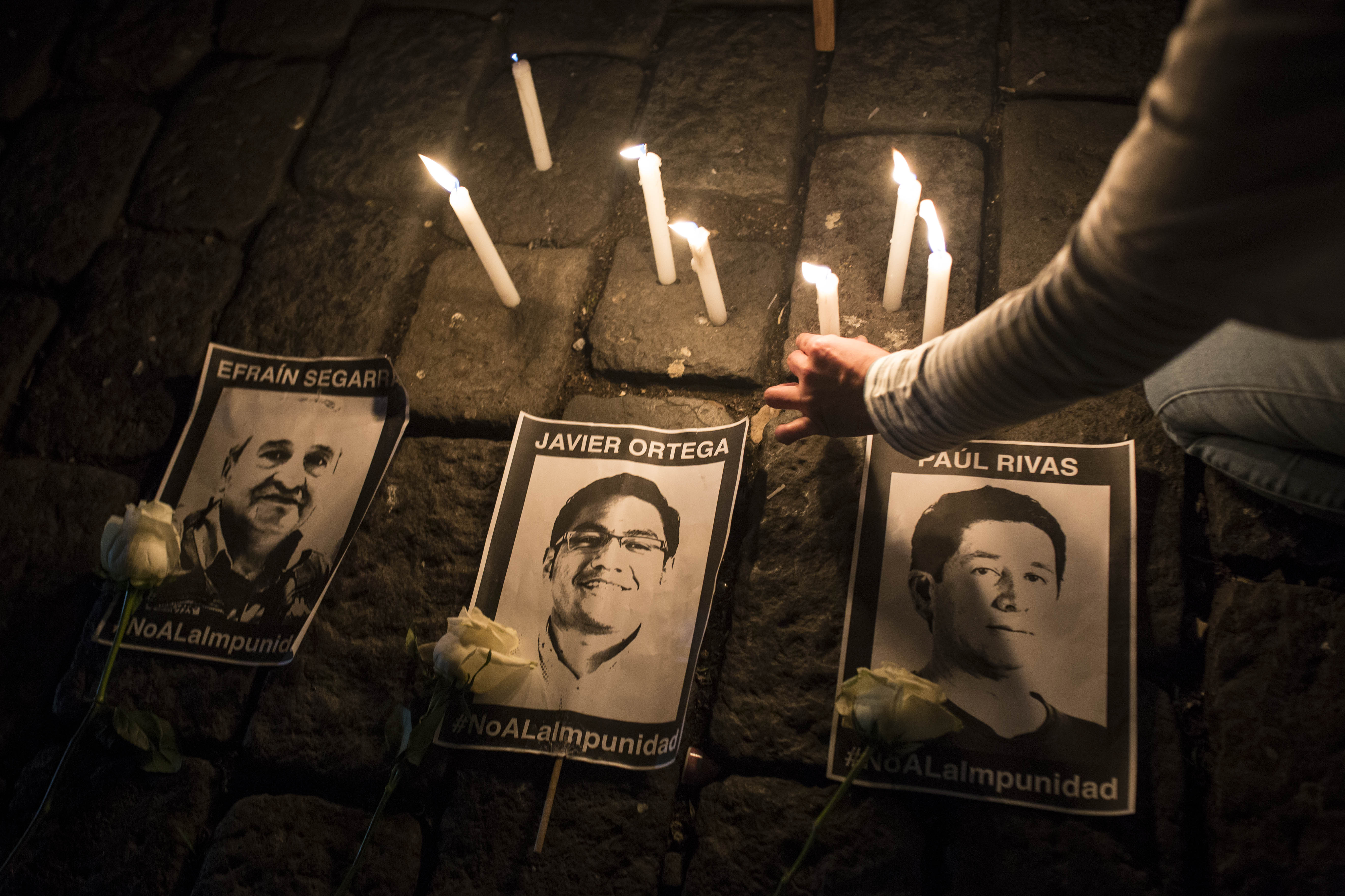Ya la noche del sábado, al pie de Carondelet, los desconocidos no lo son más. Unos son transeúntes que van de paso pero que se toman un tiempo para acercarse, encender una vela y acompañar a los amigos y compañeros de trabajo de los periodistas asesinados. «Para todos ha sido un golpe durísimo», comenta un hombre que luego descarga su rabia y enseguida sus palabras de afecto por quienes conocieron a los muertos. Otros más llegan porque se lo han propuesto, porque dicen que lo que está pasando no es solo un asunto de los periodistas o de los militares, sino de todo un país.