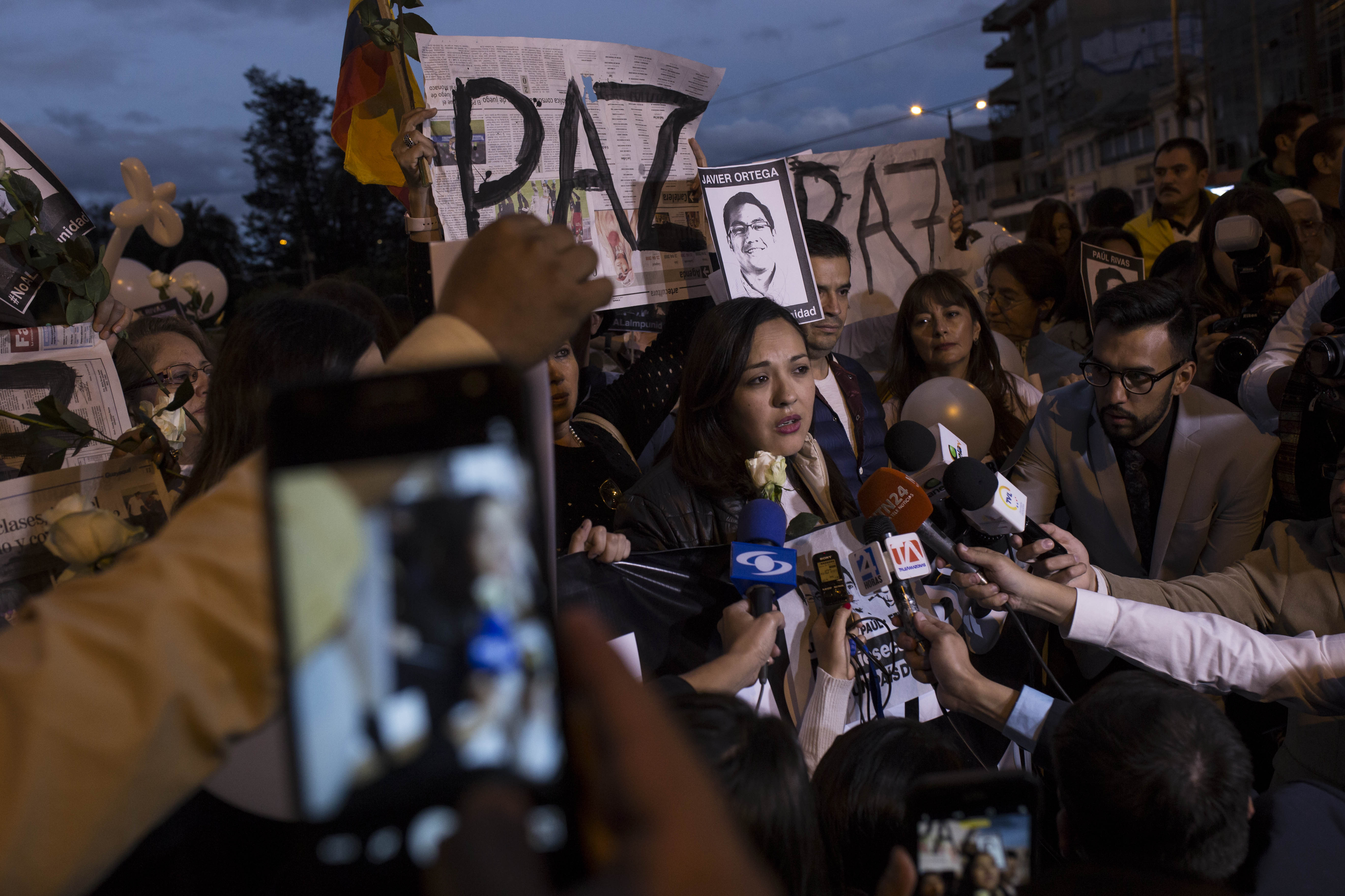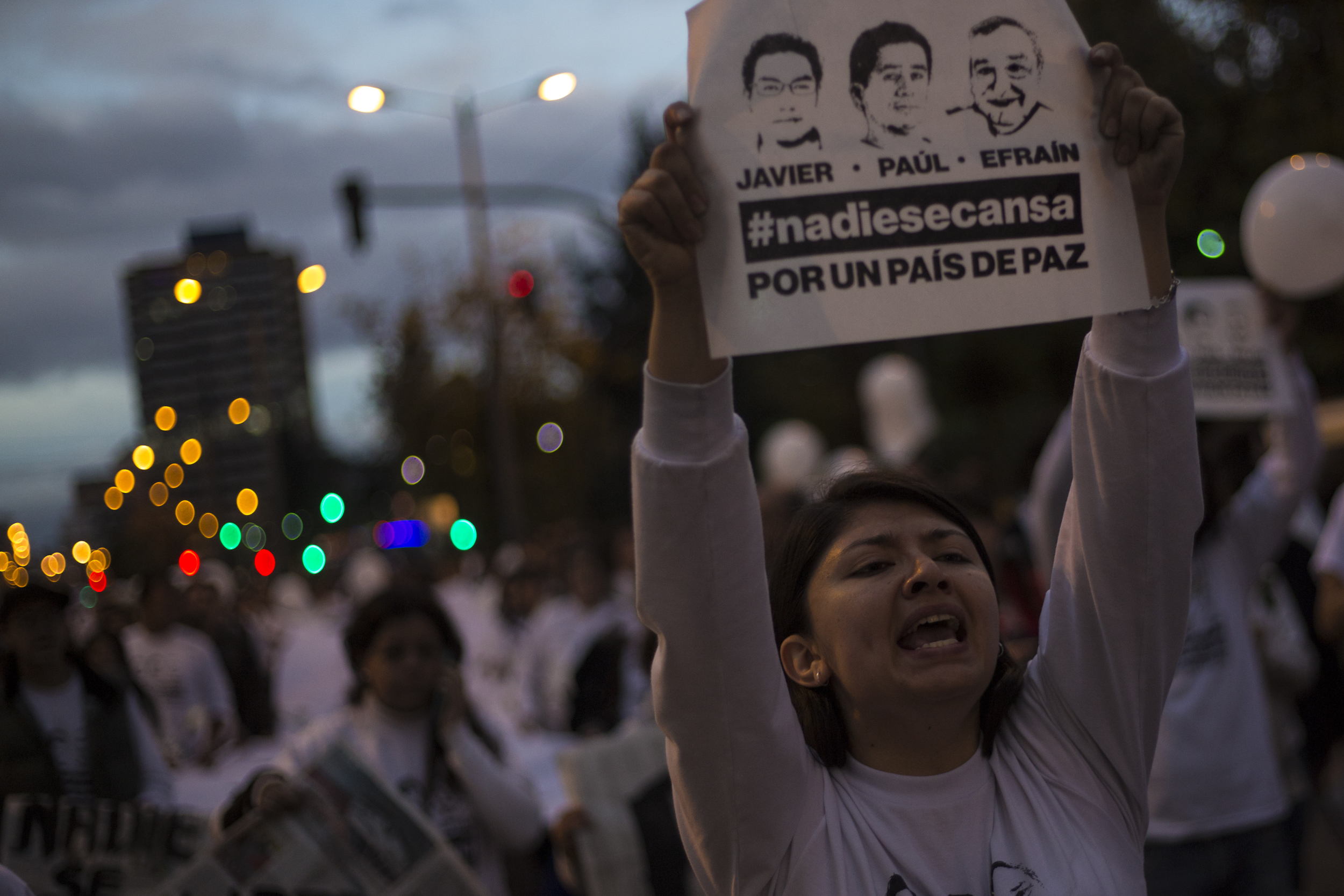Era jueves por la tarde y en las calles quiteñas marchaban miles. Habían pasado 24 días desde que el fotógrafo Paúl Rivas, el conductor Efraín Segarra y el periodista Javier Ortega, de diario El Comercio, habían sido secuestrados en la zona fronteriza con Colombia.