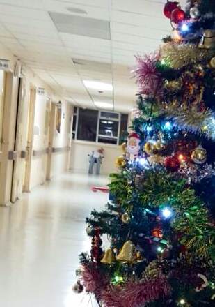 Ahora voy hacia él. Siento que los dos tenemos asuntos que arreglar. Desde lejos todavía, miro las cuencas de su careta de cartón. Siento como si esto fuese un duelo entre vaqueros. En tercer plano: voces, risas y una cancioncita de esas que vienen en las series de luces navideñas rompen con la monotonía habitual del corredor y sirven de banda sonora para este lance. Entre él y yo, solo un árbol plástico de Navidad, un pesebre con su ejército de figuritas en miniatura y un coche hospitalario –lleno de pastillas de colores y polvos blancos– que ha sido abandonado. Estoy más cerca. Una, dos, tres… cinco puertas entreabiertas en el trayecto y tras ellas, varios pacientes que intentan dormir para olvidar que dentro de pocos minutos llegará el Año Nuevo y tendrán que pasarlo solos. Los más viejos del piso, en cambio, sí están acompañados por algún pariente: el responsable de llevar y traer las bacinillas, de hacer la conversa al doliente, de girar la palanca para subir o bajar la cama y, a veces, ya vencido por el cansancio y resignado a la incomodidad, de roncar más fuerte que su propio enfermo.