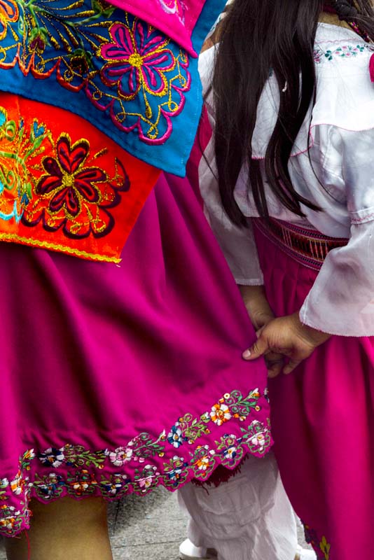 Una niña sujeta la falda de su madre durante la toma de la plaza de Santo Domingo por parte de las comunas. Esta toma simbólica marca el inicio de las fiestas en las comunas y todas las comparsas están invitadas.
