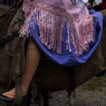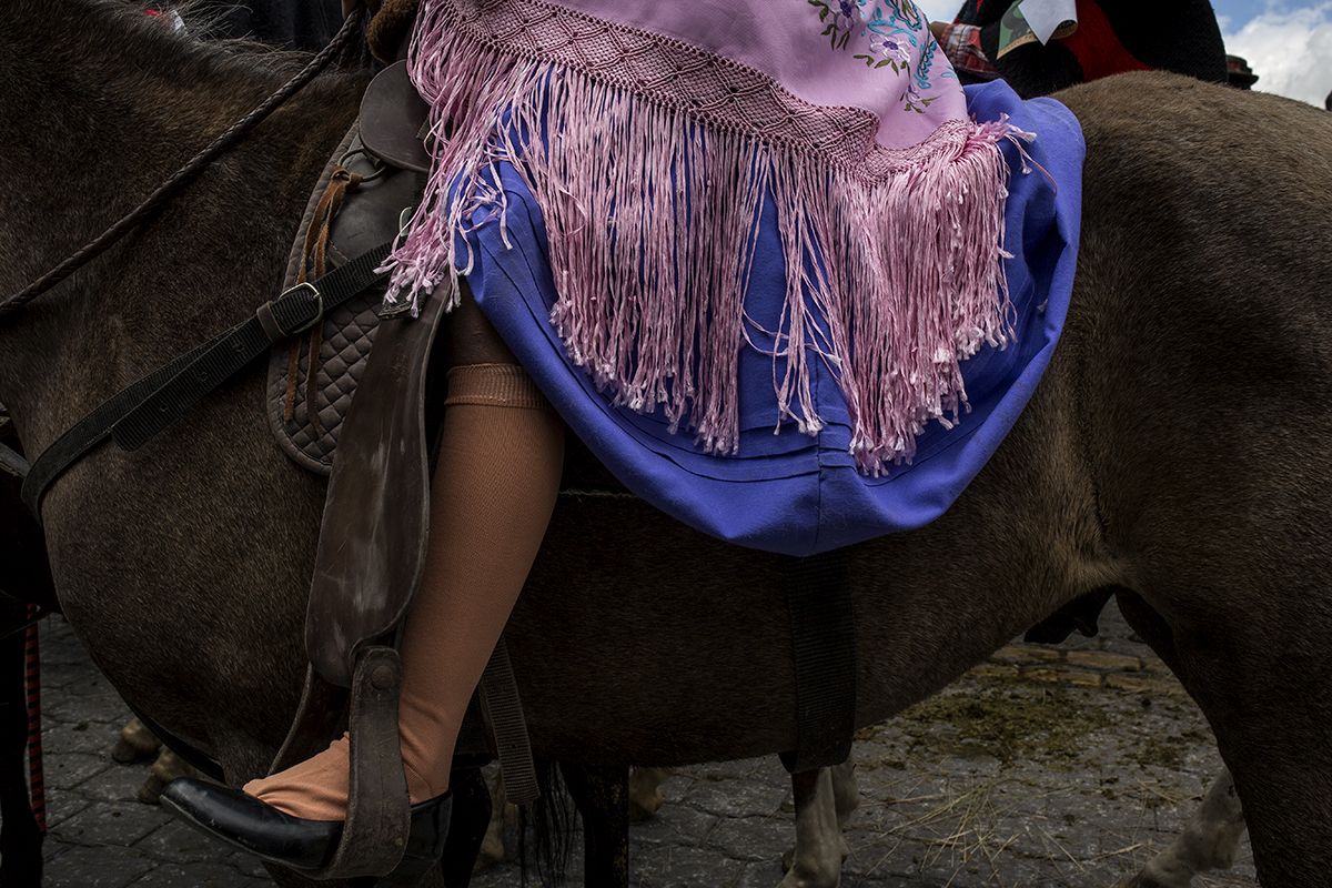 En las afueras del estadio se reúnen los chagras antes de salir al paseo. La mujer chagra, con su típica vestimenta colorida, es parte activa de esta fiesta.