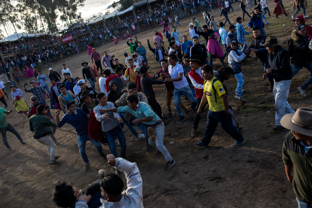 Plaza de Toros de Machachi. La multitud se pelea dentro de la plaza. Esta actitud es natural en estas fiestas. Las peleas empiezan con golpes pero pueden terminar con el uso de armas blancas, siendo de alto riesgo para la vida de quienes participan en ellas.
