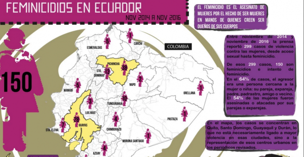 Hace algo más de tres meses Alisson, Sara, Iñigo y yo (miembros del Colectivo de Geografía Crítica del Ecuador) emprendimos el trabajo de revisar tres periódicos de circulación nacional con el objetivo de producir un mapa de la violencia feminicida en el Ecuador. Nos inspiró el trabajo de una artista mexicana, Sonia Madrigal, quien está construyendo una cartografía de los feminicidios en su país, como parte de su proyecto La Muerte sale por el Oriente. Ella ha invitado a organizaciones de toda América Latina a contribuir al mapa en construcción; hoy cuenta con casos de México, Argentina y Ecuador. Nuestro objetivo, más que sistematizar una geografía de la violencia contra las mujeres, fue volver visible la cantidad de casos. Es el mapa como instrumento de comunicación. Todo en el marco de la Marcha Vivas Nos Queremos, convocada en Quito el 25 de noviembre pasado.