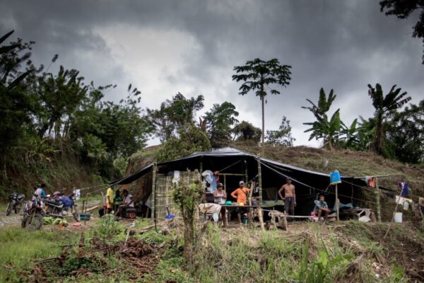 Imagen de portada: Luego de varios intentos de desalojo y de que fueran tumbados los campamentos del kilómetro 33, Manuel Torres resiste junto a una veintena de familiares y amigos con quienes ha montado esta tienda construida con caña gadua y plástico, para impedir que los administradores y operarios de la empresa les desalojen. Foto: Iván Castaneira.