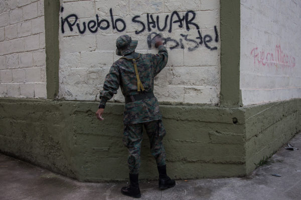 Una fila de militares sale a nuestro encuentro cuando nos acercamos a entregar el veredicto del tribunal ético. Hoy, los militares ecuatorianos trabajan como guardias privados del capital extranjero, también en Zamora. Presiden nuestra comisión las lideresas en resistencia Isabel Anangonó, Zoila Castillo, Carmen Lozano, Carmen Suquilanda. Se suma Simón Espinosa desde la Comisión Nacional Anticorrupción, quien a sus 89 años se toma el campamento con todo el desparpajo que le da su probidad. “No hay nadie que les reciba. Trabajamos para una tercerizadora.” A la vez, un grupo de activistas se ha tomado la ruta para mandar un S.O.S.: están destruyendo el pulmón a través del cual respiramos todos. Esto no es menos cierto por parecer un cliché: están yendo contra nuestra respiración.