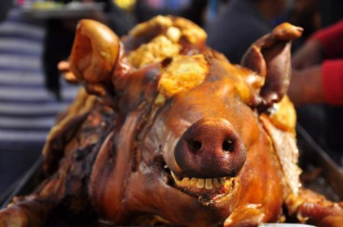 La agresividad de esas desordenadas fragancias nos hizo recorrer al menos dos veces el local de un extremo al otro. El mote con chicharrón batallaba ferozmente contra la corvina frita y el encebollado. Sobre una larguísima fuente de hojalata, coqueto, un chancho hornado me lanzó su sonrisa de ciento ochenta grados.