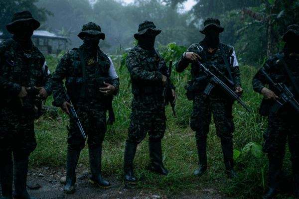 Grupos criminales como los Comandos de la Frontera, disidencias de las ex FARC y los grupos ecuatorianos Los Lobos y Los Choneros compiten violentamente por el control de la producción de cocaína y la minería ilegal de oro. El resultado son miles de hectáreas deforestadas de un ecosistema clave para la mitigación climática y el riesgo de desaparición de pueblos indígenas que resguardan la Amazonía.