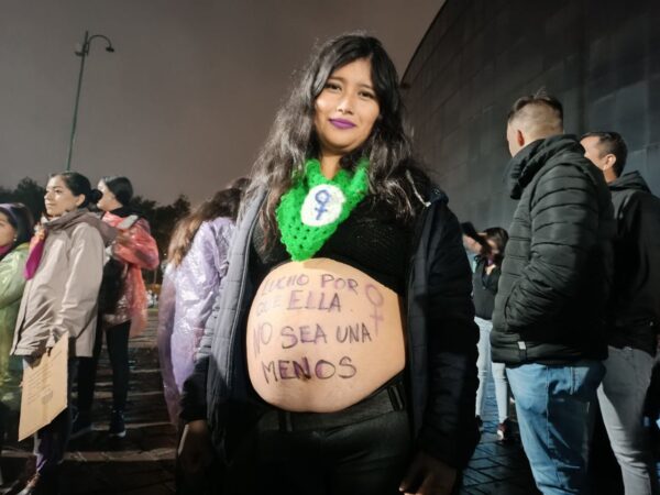 Eran las 18:30 de la tarde cuando la marcha llegó a la sede de la Casa de la Cultura para terminar la jornada. En la puerta del lugar, una mujer embarazada aún esperaba a sus compañeras. “Lucho porque ella no sea una menos”, se leía en su cuerpo. Con un pañuelo verde, símbolo de la lucha por el derecho al aborto, la mujer abrazaba a las compañeras que, emocionadas, encontraban en su mensaje las fuerzas para continuar en la marcha.