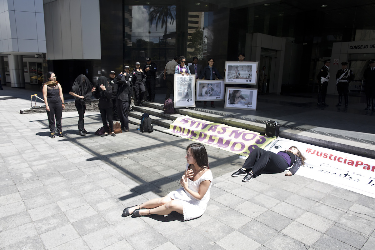 Ruth Montenegro, madre de Valentina Cossíos Montenegro, aparece junto a activistas articuladas en torno a la plataforma Justicia para Vanessa, en Quito, un día antes de la audiencia en Ambato. Foto: Edu León.