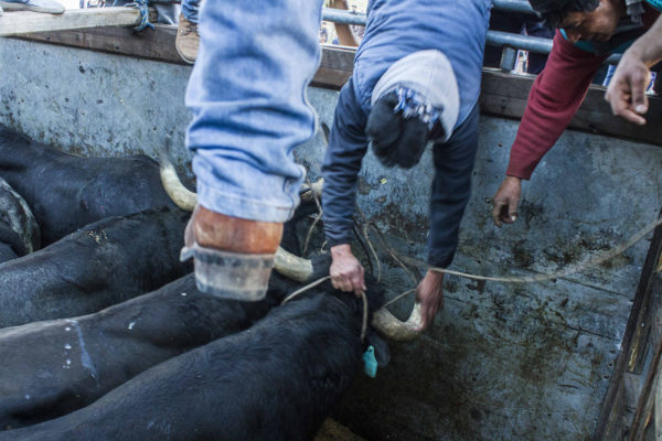 Al llegar a las chicanas, ya en la plaza, nos juntamos con otros colegas: Mario y Belén, y buscamos un sitio estratégico. Decimos que somos parte de un equipo de prensa y el hombre que está detrás de los plásticos, cobrando la entrada, nos deja pasar hasta un cuadrante vacío del tercer piso, cubierto por cintas amarillas que dicen “PELIGRO”. Una de las vigas está rota. Nos sentamos y empezamos a capturar imágenes de los cerca de cien hombres que intentan llamar la atención de dos toros negros y fornidos. Unos visten de chagras y otros con ropa informal con marcas de imitación: Nike, Gucci, Adidas.