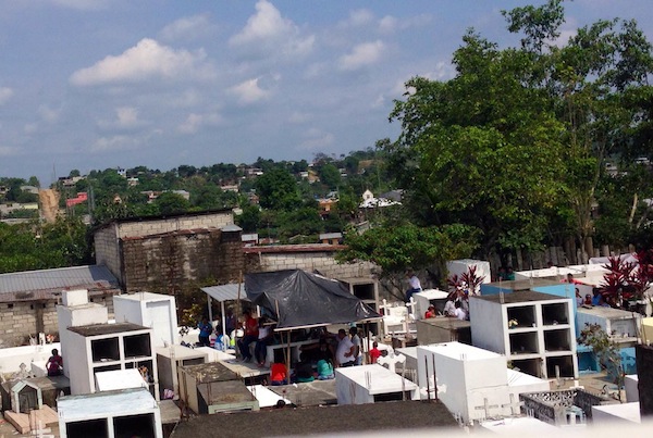 Aunque el aire era más fresco cuando cayó por fin la noche, el cementerio municipal del pueblo –ese laberinto de basura y cruces de piedra despostillada– estaba colmado de deudos borrachos y comerciantes que lloraban o brindaban con pílsener o con aguardiente. ¡A ver la cola’ mora’, a cincuenta centavos! Un grupo de niños jugaba a esconderse detrás de los muros de los nichos abandonados mientras un sexteto de músicos rasgaba guitarras y requintos, ofreciendo una serenata de pasillos a los muertos de los otros, a cambio de unas monedas. Un perro negro, impávido hasta el trance, dormía dentro de un sepulcro desocupado para refrescarse un poco. Nadie vio cuando uno de los chicos salió del cementerio con una camiseta distinta a la que llevaba al entrar a la carrera. Él solo cruzó el umbral del portón principal y se desvaneció entre el humo de las frituras, las luces policiales y los globos de colores.