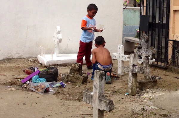 Los tres venados avanzaban entre los niños que jugaban trepando sobre las tumbas, entre las familias que recogían los restos de la comilona que habían compartido esa tarde con sus muertos.